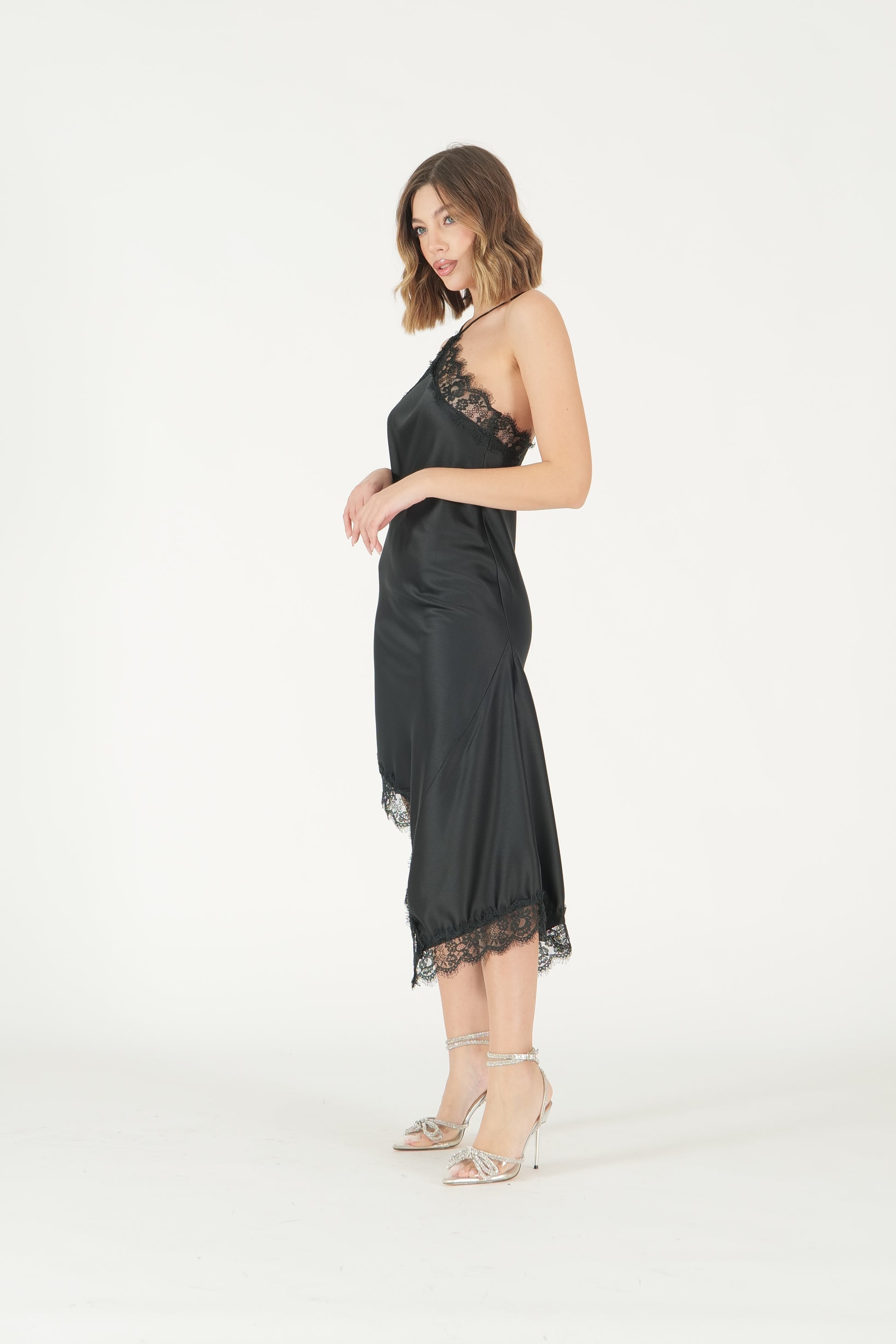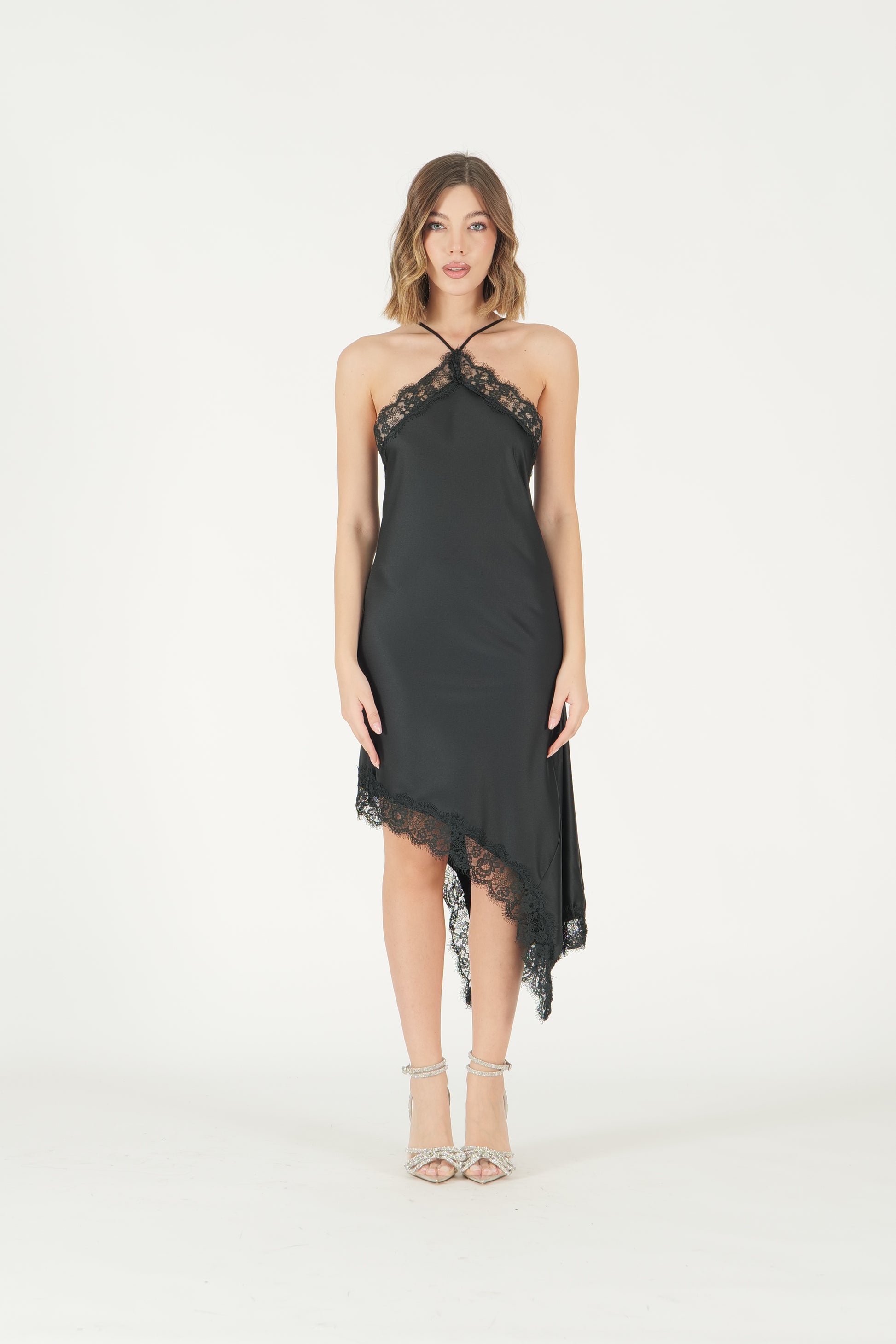 Abito asimmetrico con profili in pizzo