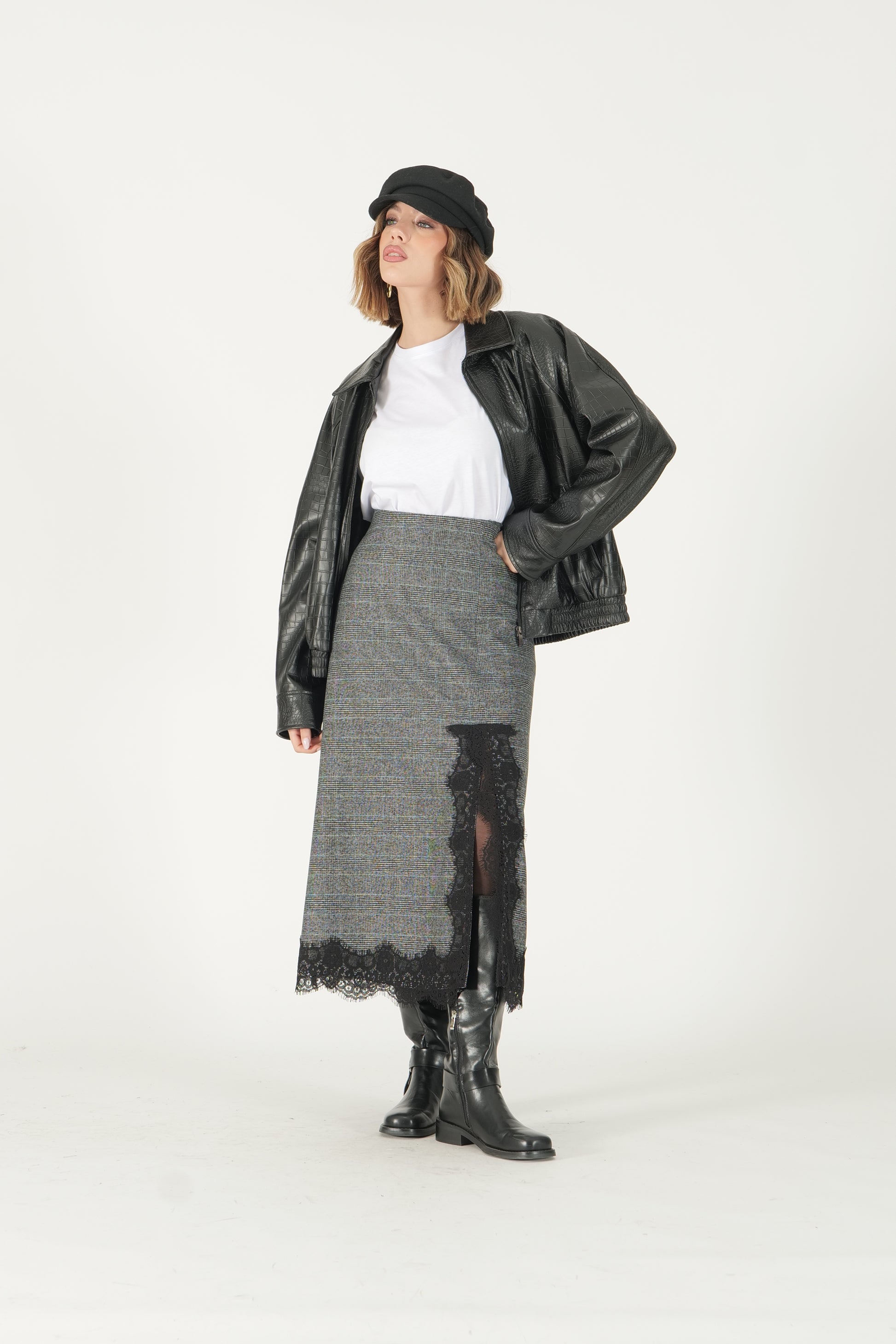 Gonna midi tartan con dettaglio pizzo